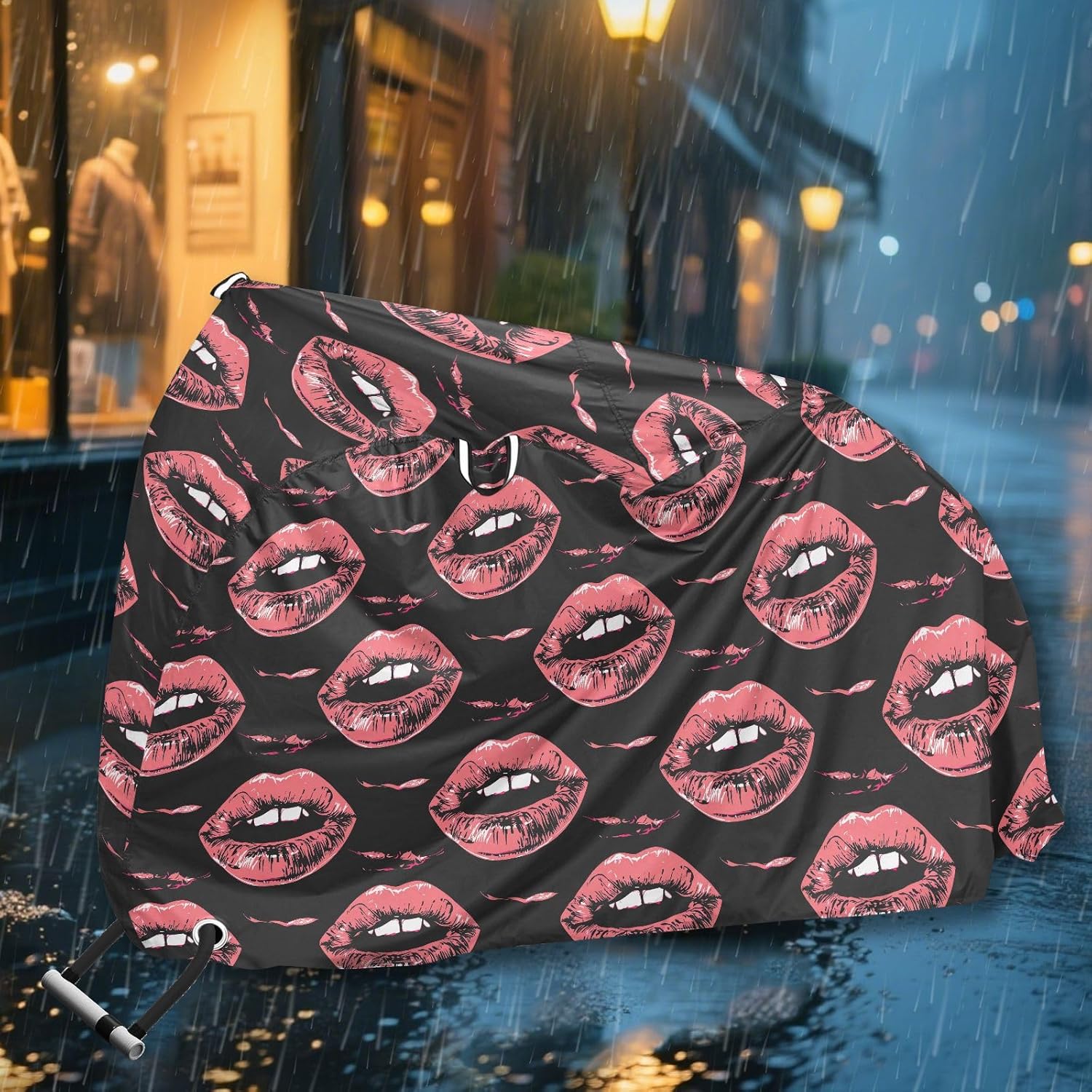 Protect your bicycle in style with our premium bike tarp, engineered for maximum defense against harsh elements. Unlike basic covers, we use specially engineered umbrella waterproof fabric - the same advanced material used in high-end rain umbrellas - delivering superior performance with unique visual appeal. Sun & Heat Defense Our fabric creates a physical cooling barrier that actively lowers your bike's temperature by: Blocking 95%+ harmful UV rays to prevent paint fading Providing exceptional shading & heat insulation (up to 20℉/11℃ reduction vs direct sun) Offering SPF 50+ equivalent protection for sensitive components Rain & Dust Protection Water-repellent coating causes rain to bead and roll off Tightly woven fabric acts as dustproof barrier for long-term storage Prevents moisture buildup with breathable side panels (prevents condensation) User-Focused Design LOCK ACCESS HOLE at front wheel enables secure locking without removing cover ADJUSTABLE BUCKLE STRAP at rear wheel anchors cover during strong winds Reflective safety strips on handles enhance nighttime visibility Ultra-lightweight (23 oz) folds into included pouch Unbeatable Aesthetics Choose from over 1,000 designer patterns - from sleek geometrics to vibrant nature motifs - transforming your bike into a street-style statement while competitors offer only solid colors.