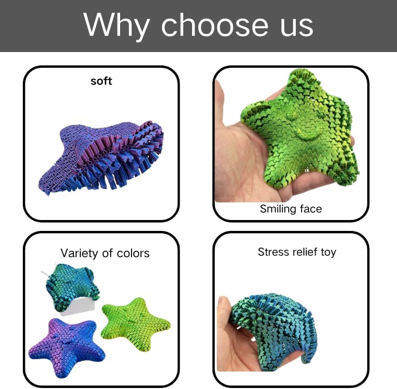 discover the magic of our 3d printed flexi toy stars, the perfect small fidget toys for all ages. these cute and colorful sensory fidget stars transform into a large starfish, offering unique stress relief toys for your desk or office. crafted as quiet and silent fidgets, they provide fun anxiety relief while doubling as adorable starfish decorations. each mini star is a squishy and flexible sensory fidget star, ideal for para crafts or sea-themed decor. available in rainbow hues like pink, yellow, green, and blue, these best fidget toys are a must-have for anyone seeking cute and relaxing desk decorations. whether as a stuffed animal alternative or playful starfish para decoración, these 3d printed fidget toys bring joy and calm to any space. perfect as gifts or personal use, our flexi stars are the best fidget toys for sensory seekers and star lovers alike.