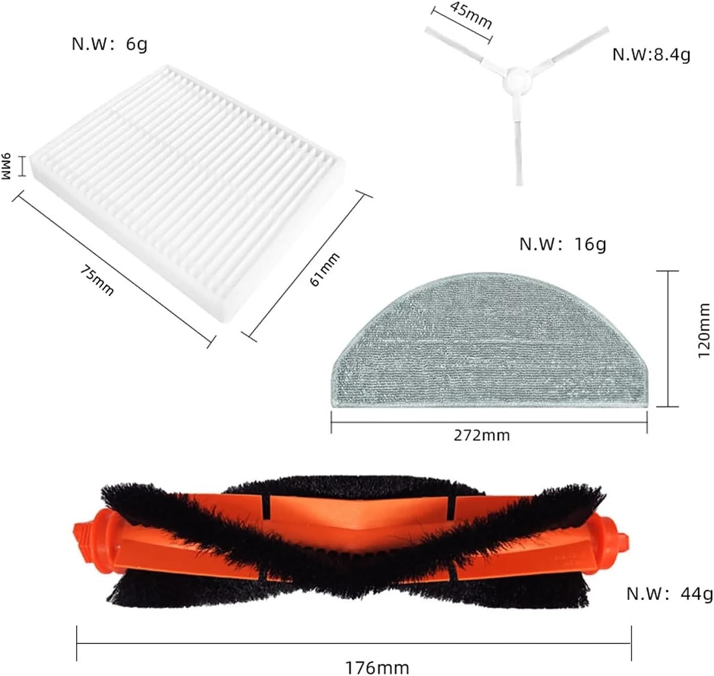 Compatible Models:Compatible for Xiaomi E10Compatible for Xiaomi E12Compatible for Xiaomi B112Material:plasticPackage Contents:2 x roller brush6 x side brush4 x hepa filter4 x mop clothHello dear buyer, thank you for your choice. We have high quality vacuum cleaner accessories that can help your vacuum cleaner back to good working condition. Solve your cleaning problems. If you have any questions before you place an order you can tell me, I will help you solve all the problems you encounter.Sincerely greetings